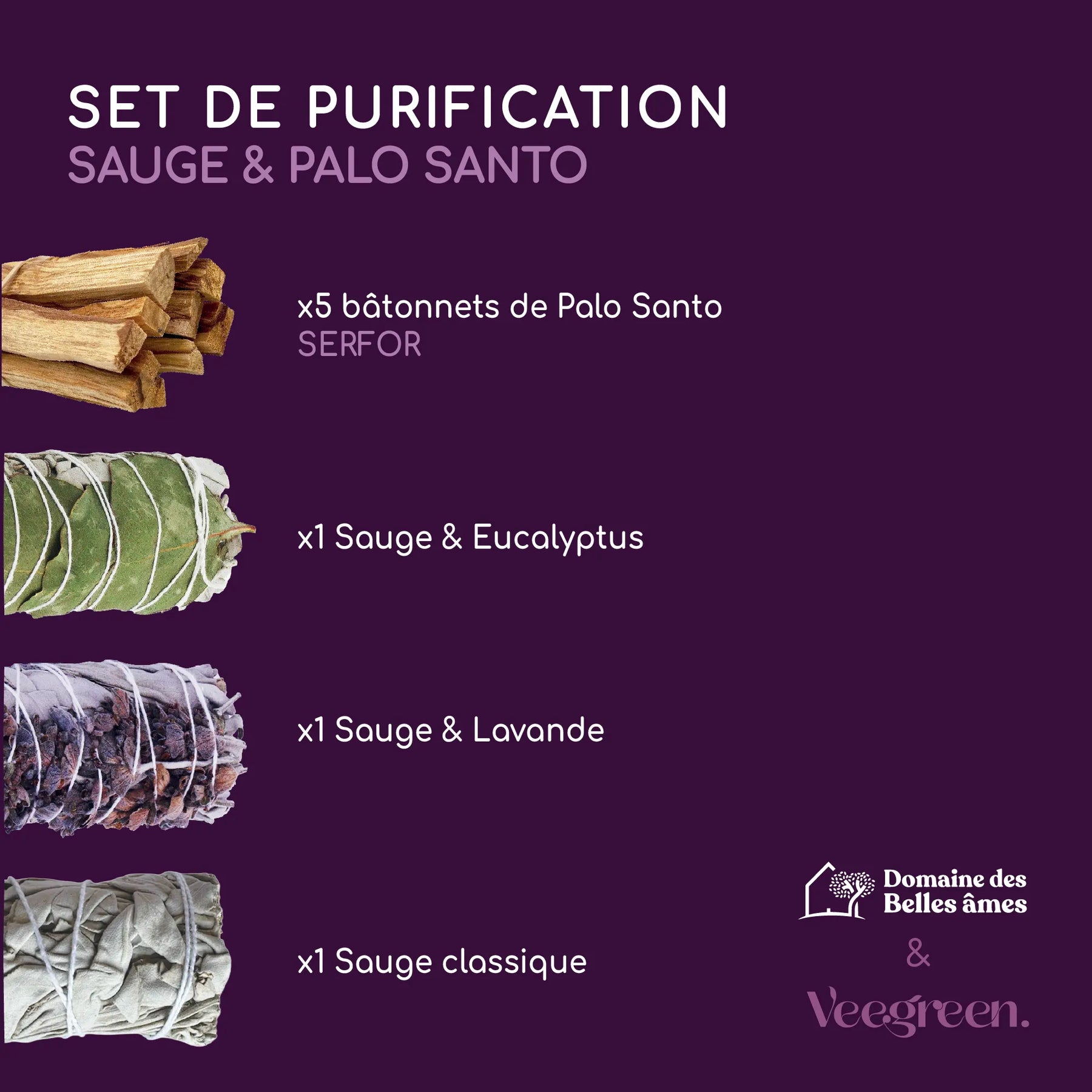 À l’intérieur, un rituel complet composé de 1 Sauge Blanche Classique, 1 Sauge avec Lavande, 1 Sauge avec Eucalyptus et 5 bâtonnets de Palo Santo Bursera Graveolens.